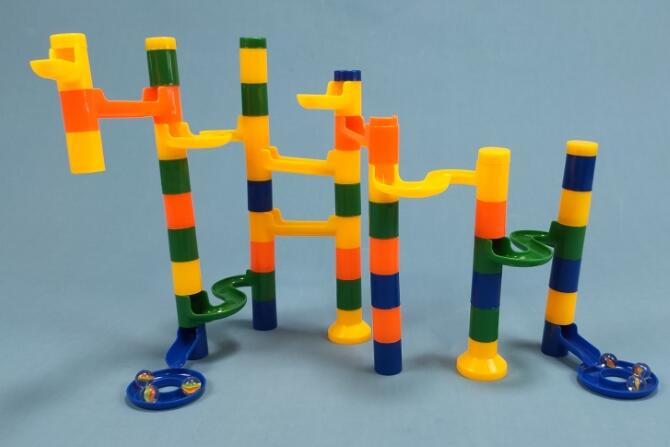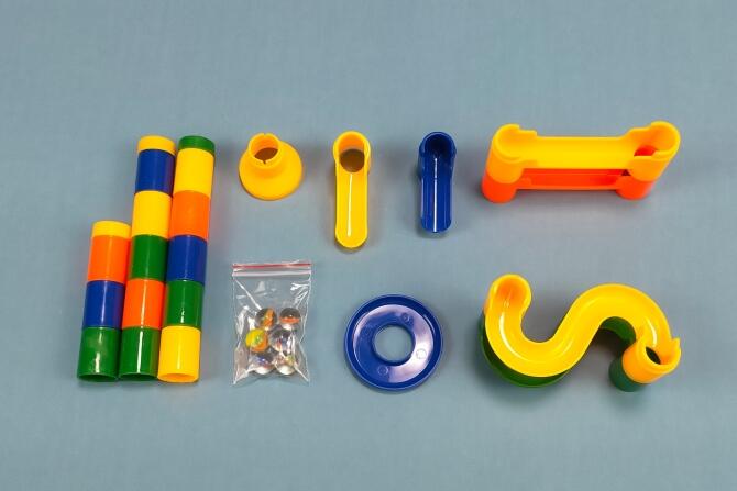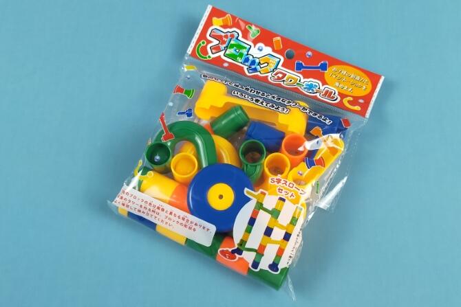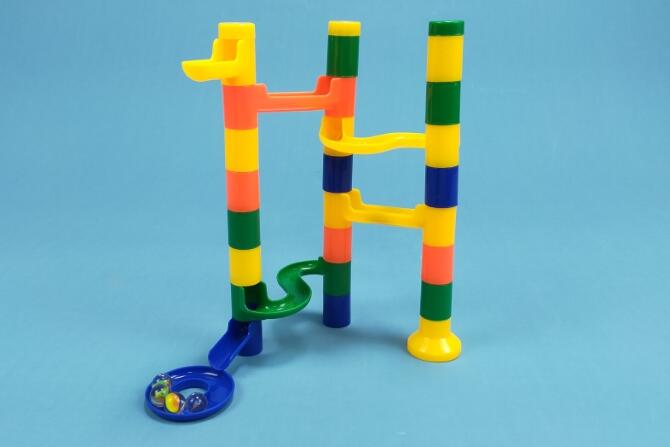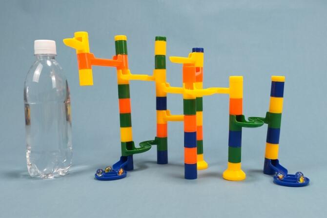 「ブロックタワーボール」はゴールにボールが入るようにコースを組み立てるからくり装置タイプのおもちゃです。コースは自由に作れますし、ボールの転がる音が心地良いですよ。