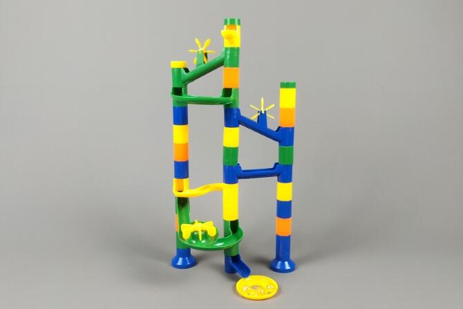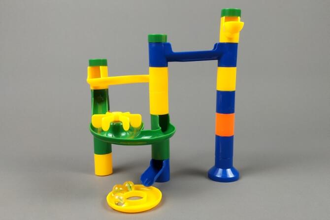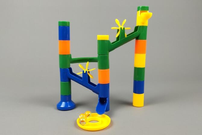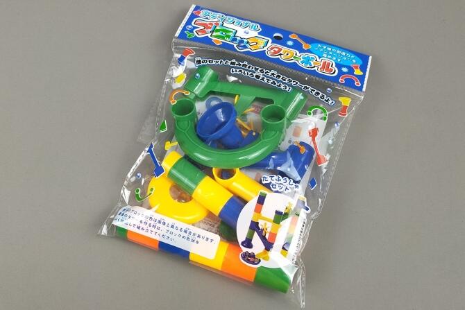 「アディショナル ブロックタワーボール」はゴールにボールが入るようにコースを組み立てるからくり装置タイプのおもちゃです。コースは自由に作れますし、ボールの転がる音が心地良いですよ。