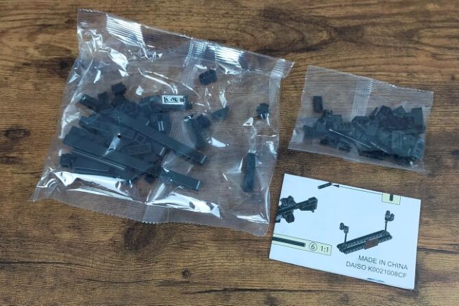 「ブロック(銃、C)」はレゴブロックと互換性のあるブロックで自動小銃を作れるダイソーのブロック玩具です。