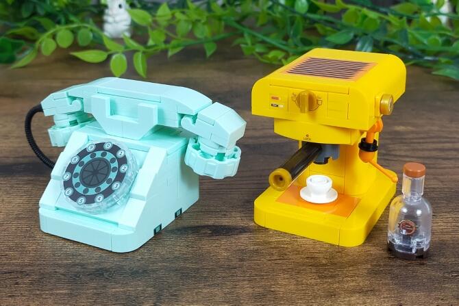 「ブロック電話/ブロックコーヒーマシン」は再現度が高い電話機とおしゃれなコーヒーマシンを自分で組み立てて飾りたい人におすすめです。