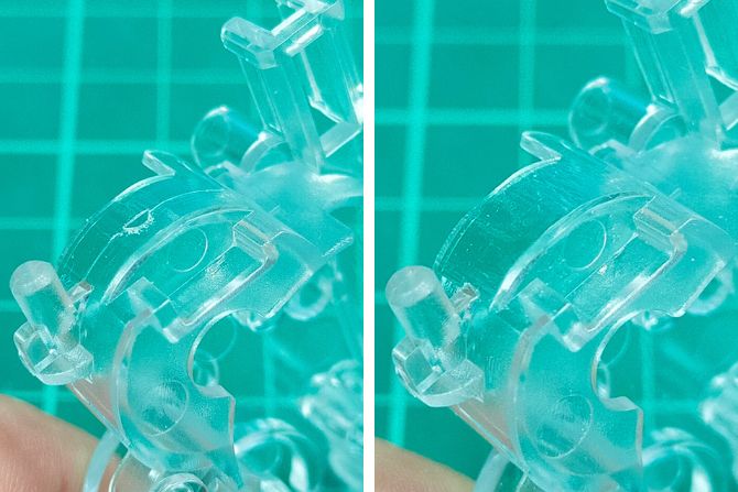 そして、塗装して隠すことができないクリアパーツのゲート跡はガラスヤスリを使って処理しました。きれいに消えてるでしょ?
