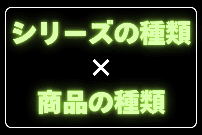 各シリーズに各種類の商品があるので、具体的な商品は上記の①と②の組み合わせで決まります。つまり、下記の通り。