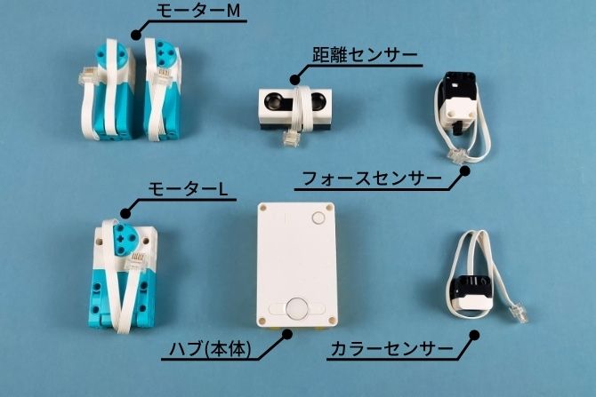 本体のハブとモーター×3,距離センサー、フォースセンサー、カラーセンサーです。