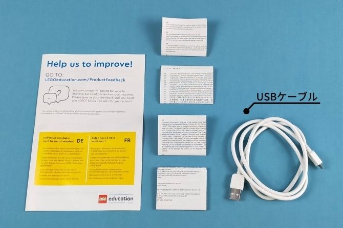 注意書きの紙類とUSBケーブルです。USBケーブルはハブの充電やプログラムの転送に使います。