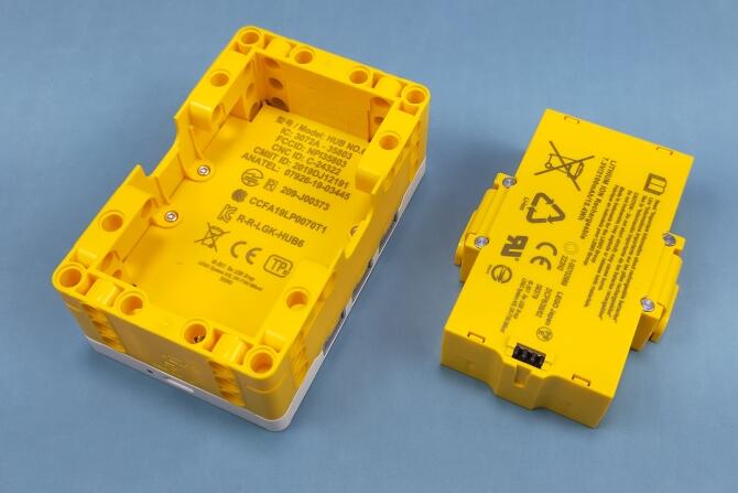 まずは、ハブです。この中に小さなコンピューターが入っており、モーターやセンサーを制御します。