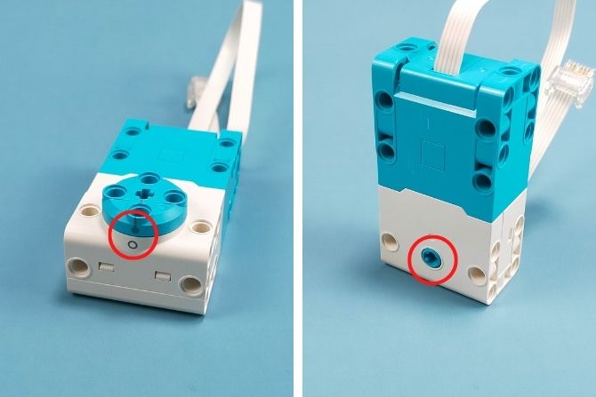 そして、モーターには印があり(左)、回転位置がわかりやすいようになっています。また、モーターの裏にも軸を取り付けられる穴があり(右)、柔軟なロボット製作ができるようになっています。