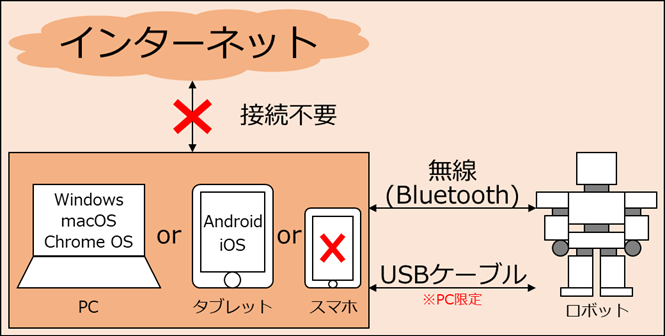 デバイスとロボットはBluetoothか付属のUSBケーブルで接続します。