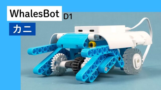 「WhalesBot D1」には21種類の作例があります。その中の「カニ」はハサミをチョキチョキしながら移動するロボットです。ハサミを動かす構造は少し工夫が凝らしてあります。