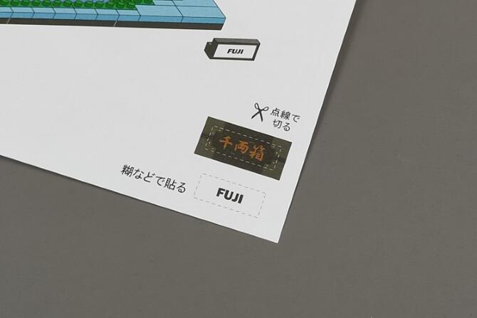 前面の「FUJI」と「千両箱」の文字は説明書を切り取ってのりなどで貼り付けます。