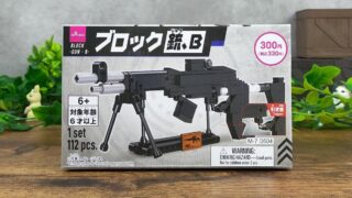 「ブロック(銃、B)」はレゴブロックと互換性のあるブロックで自動小銃を作れるダイソーのブロック玩具です。MK14という銃をモチーフにしたキットです。