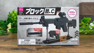 「ブロック(銃、C)」はレゴブロックと互換性のあるブロックで自動小銃を作れるダイソーのブロック玩具です。SLRをモチーフにした銃です。