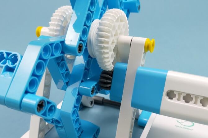 可動部分です。モーターの回転と小さなギアは直結しており、小さなギアが大きなギアを回すことで大きな力を出します。