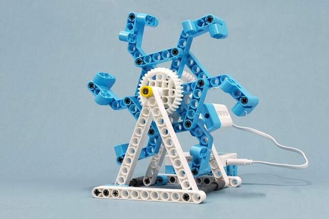 大きさの違うギアを使うことで大きな車輪を回転させることができました。また、速度も速くて迫力がありました。